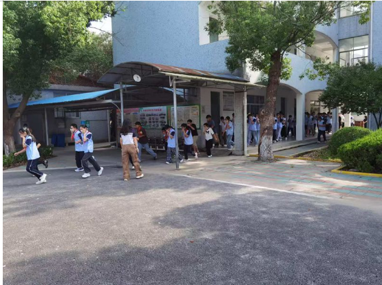 10月13日学校利用大课间时间,组织师生开展应急疏散演练,增强事故预防和应急避险能力。消防警报拉响后,在班主任引导下,学生用湿毛巾捂鼻、弯腰低姿,沿安全通道快速有序撤离至操场。