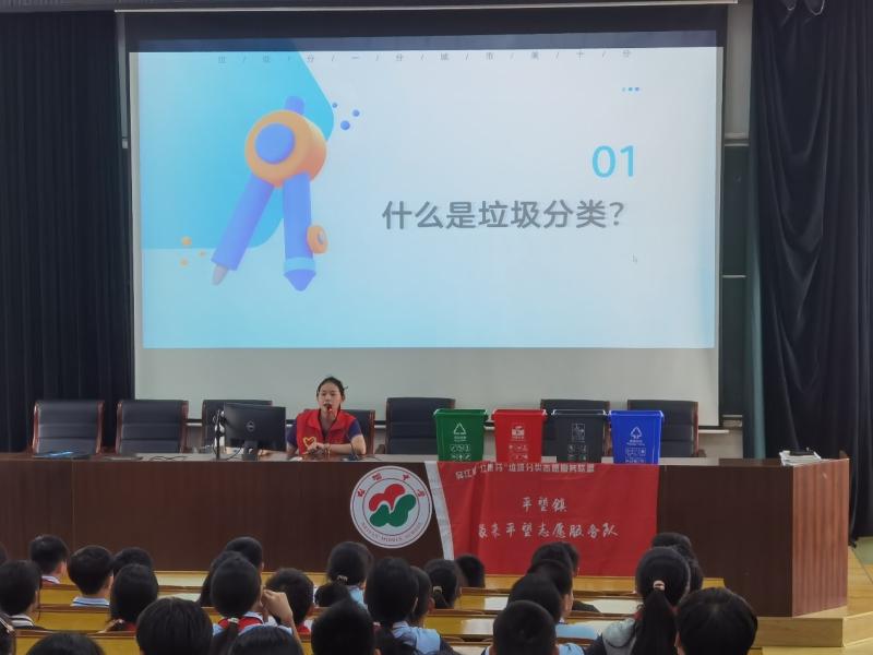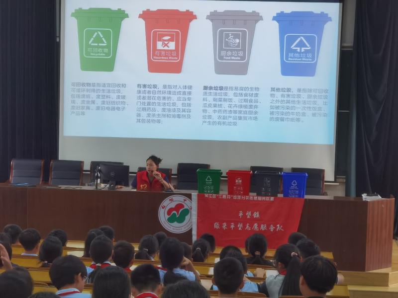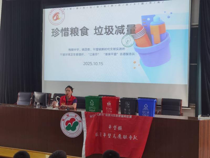为进一步加大垃圾分类的宣传力度,提升学生环保意识及文明素养,培养学生从小树立垃圾分类的观念,形成良好的行为习惯,珍惜粮食,厉行节约,拒绝餐饮浪费,营造绿色低碳的校园氛围,10月15日,平望镇团委、平望镇新时代文明实践所、平望环境卫生管理所、“江惠芬”及 “缘来平望”志愿服务队垃圾分类宣传员们来到梅堰中学,在阶梯教室为初一学生开展了一场别开生面的“珍惜粮食 垃圾减量” 垃圾分类知识主题宣讲活动。
