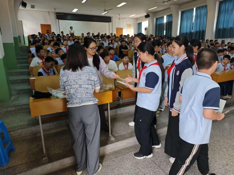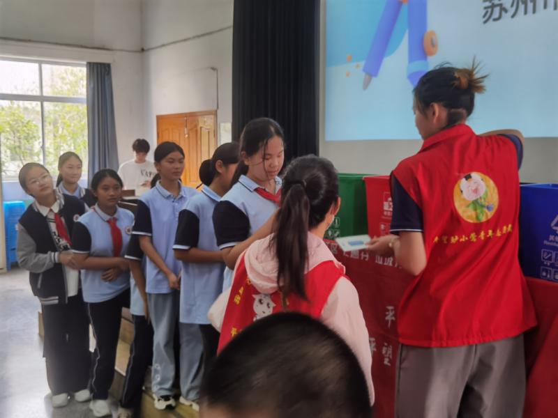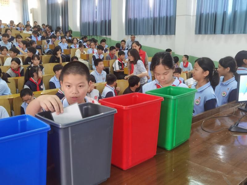 在知识互动环节,宣传员们邀请同学们走上讲台,踊跃参与,现场氛围热烈。活动在“垃圾分类大闯关”互动游戏环节迎来高潮。同学们在工作人员的带领下,积极参与“垃圾投投乐”游戏。同学们在欢乐的游戏中巩固了垃圾分类知识,进一步增强了环保理念。随后,工作人员为参与活动的同学颁发笔记本作为奖品。